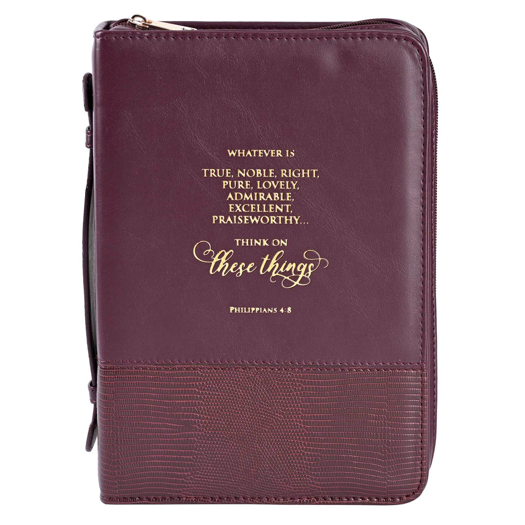 The front of this bible case features the scripture 'Whatever is true, noble, right, pure, lovely, admirable, excellent, praiseworthy - Think on these things - Philippians 4:8' Text is stamped gold foil. Made from burgundy polyurethane material Lay-flat construction, with a cross zipper pull Zipper is non-rusting and self-repairing Nylon reinforced stitching with a side carrying handle Inside is an elastic pen loop to keep your pen secure. Measures approximately 10.25 x 2 x 7.25 Inches. This timeless and versatile Bible cover is perfect for daily use, church gatherings, Bible study groups, or gifting to a loved one. Contained in protective packaging Ready for easy gifting