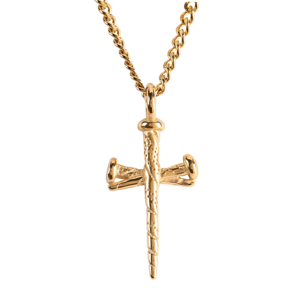 3-Nail Men's Cross Necklace, a powerful and symbolic piece that embodies strength, resilience, and faith This unique necklace features a cross design constructed from three intricately crafted nails, representing the profound sacrifice and enduring spirit associated with faith. Crafted from high-quality gold plated stainless steel. Curb chain with lobster claw clasp measures approximately 24 inches Cross measures 1.5 inches. Ideal for men who appreciate symbolic jewelry with a rugged edge, this necklace pairs well with casual, everyday attire as well as more formal ensembles, making it versatile for any occasion. Contained in protective packaging Ready for easy gifting
