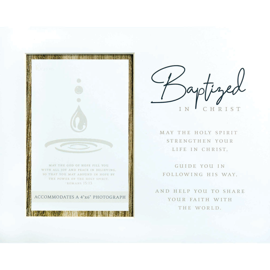 Perfect to decorate your home or the home of someone you love Features the sentiment "Baptized in Christ / May the Holy Spirit strengthen your life in Christ, guide you in following his way, and help you to share your faith with the world". Frame is made of paper Features an opening that accommodates a 4 x 6 photograph Overall frame dimensions measure approximately 8 x 10 inches. Decorative background features an abstract graphic of a drop of water falling into water. Perfect as a decorative, commemorative display atop a shelf or a desk. Contained in protective packaging Ready for easy gifting for a birthday, holiday, or other celebration