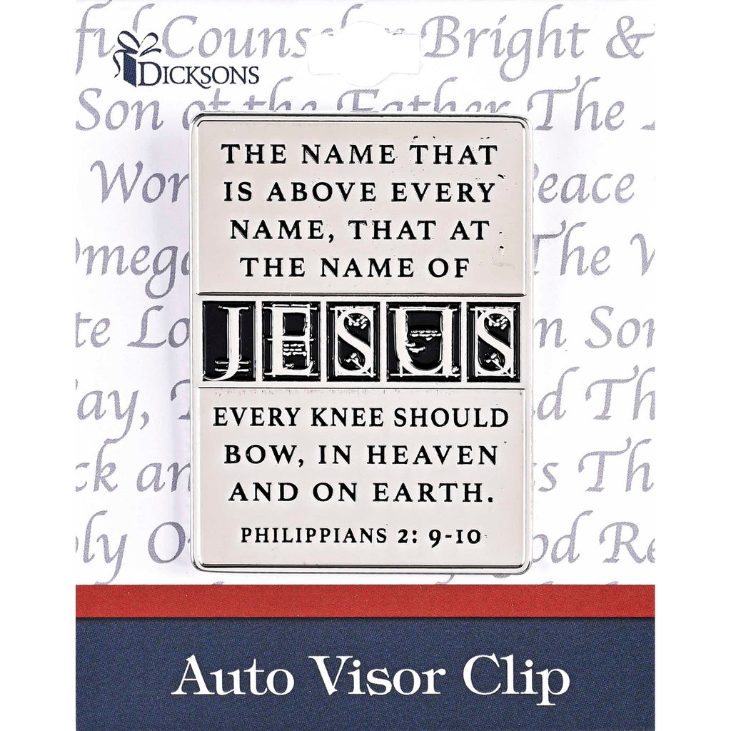 Automobile visor accessory features sentiment reading "The Name That Is Above Every Name, That At The Name Of Jesus Every Knee Should Bow, In Heaven And On Earth. Philippians" 2:9-10. Accessory is made of zinc alloy metal with brushed silver tone finish. Automotive visor accessory measures approximately 2 inches Wide footprint of the clip allows for attachment to the visor without leaving an imprint. Display this beautifully designed clip on your car visor as a daily reminder. Contained in protective packaging Ready for easy gifting for a birthday, holiday, Christmas, or other celebration