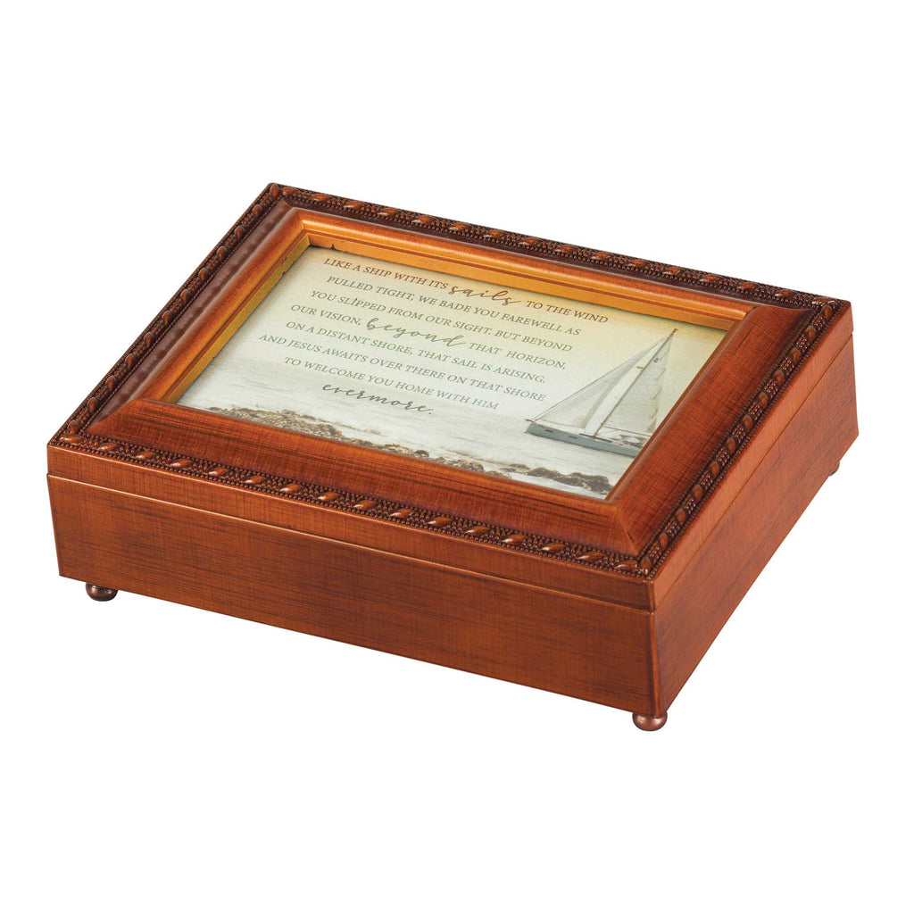 Elegant and meaningful keepsake box features bereavement poem, "Like A Ship With Its Sails To The Wind Pulled Tight, We Bade You Farewell, As You Slipped From Our Sight But Beyond Our Vision, Beyond That Horizon, On A Distant Shore, That Sail Is Arising And Jesus Awaits Over There On That Shore To Welcome You Home With Him Evermore". Made of a high quality acrylic polymer material and inside is lined with a luxurious black velvety material Inside box is a small compartment with clear glass top that shows the high quality Sankyo musical movement Wind the key under the box to hear tune "Amazing Grace". Print is under glass and can easily be changed out for a favorite photo cut to 4 x 6 Overall size measures approximately 8 x 6 x 2.75 inches. Perfect atop a dresser, vanity, or shelf Holding your special belongings, making this a great giftable item for the special lady in your life. Contained in protective packaging Ready for easy gifting for a birthday, holiday, Christmas, Mother's Day or other celebration