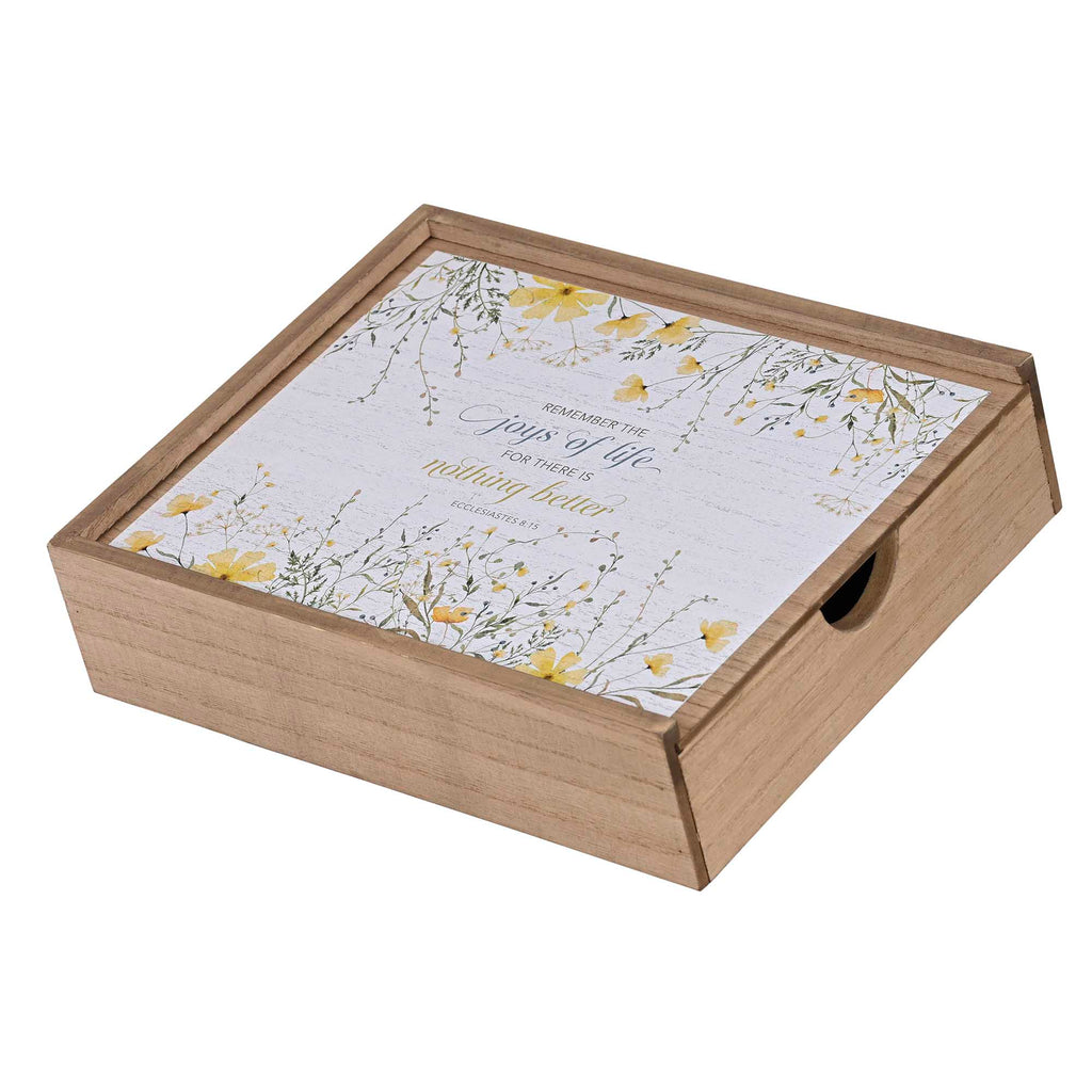 Features a beautiful paraphrase of Ecclesiastes 8:15 – “Remember the joys of life, for there is nothing better.” A comforting reminder to cherish blessings and live with gratitude. The sliding lid showcases delicate yellow and white flowers with soft greenery, adding a peaceful, uplifting touch to any space. Crafted from durable MDF with a natural woodgrain look, combining strength and beauty for a rustic yet refined keepsake box. Measures 9.5” x 11.75” x 3” —perfect for storing photos, letters, jewelry, or treasured mementos. Comes packed in a white box, making it a thoughtful gift for Mother’s Day, birthdays, weddings, or memorial occasions Ideal for anyone who values faith and meaningful keepsakes