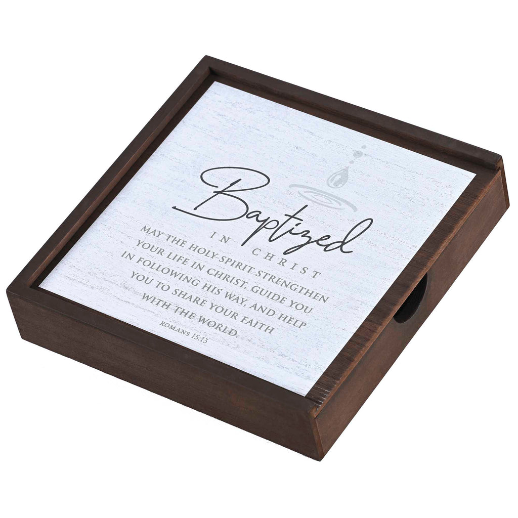 Memory keepsake box features a watermarked water droplet on the lid with text: Baptized in Christ - May the holy spirit strengthen your life in Christ, guide you in following His way, and help you to share your faith with the world. Romans 15:13. Made from durable MDF wood, this box ensures lasting strength and a polished, natural finish. Measures approximately 9.5 x 2 inches Features a sliding lid mechanism for easy access while keeping contents secure The lid slides effortlessly along grooves, ensuring a snug fit to protect your items from dust and damage. Display it proudly on a shelf, dresser, or desk for both practical use and decorative appeal. Contained in protective packaging Ready for easy gifting