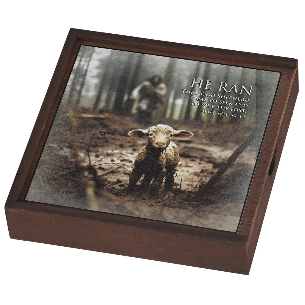 Keepsake box features Jesus running after a lost lamb, with text: He ran - The good shepherd came to seek and to save the lost. Matthew 18 Luke 19. Made from high-quality MDF wood with a walnut colored finish, this keepsake box is both sturdy and lightweight The smooth sliding lid ensures easy access to the contents, making it both practical and secure. Measures approximately 9.5 x 2 inches. Perfect for storing precious keepsakes, jewelry, letters, and personal treasures while offering a spiritual reminder of God's loving guidance and care. Contained in protective packaging Ready for easy gifting