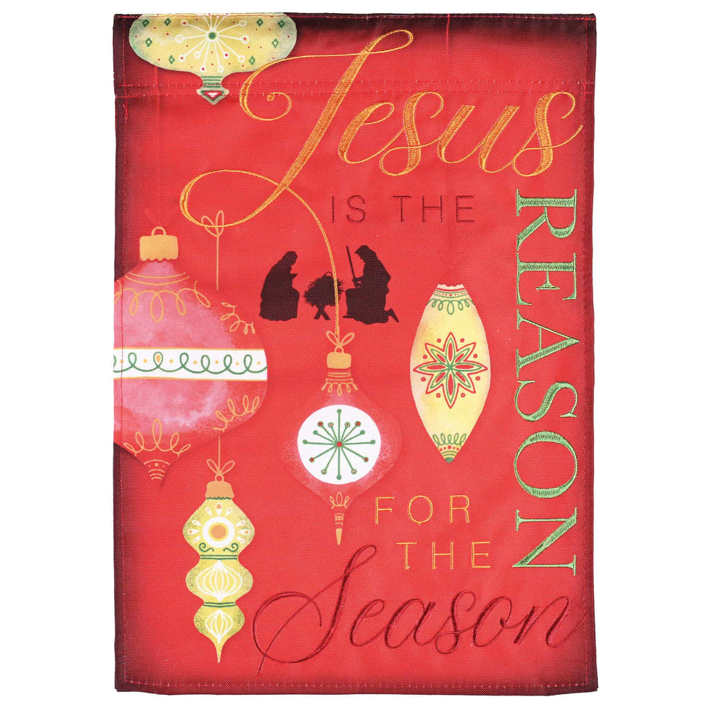 Christmas flag with an ornament design and the words,' Jesus is the reason for the season'. Crafted from heavy-duty 650 single-thickness denier polyester Design is sublimated to become part of the fabric, not just printed on the surface Design on front and back. Measures approximately 18 x 13 inches Fit most standard size poles (not included). As you adorn your garden or yard with this poignant message, you'll not only infuse your outdoor decor with meaning but also invite passersby to pause and reflect on the deeper significance of the holiday season. Contained in protective packaging Ready for easy gifting