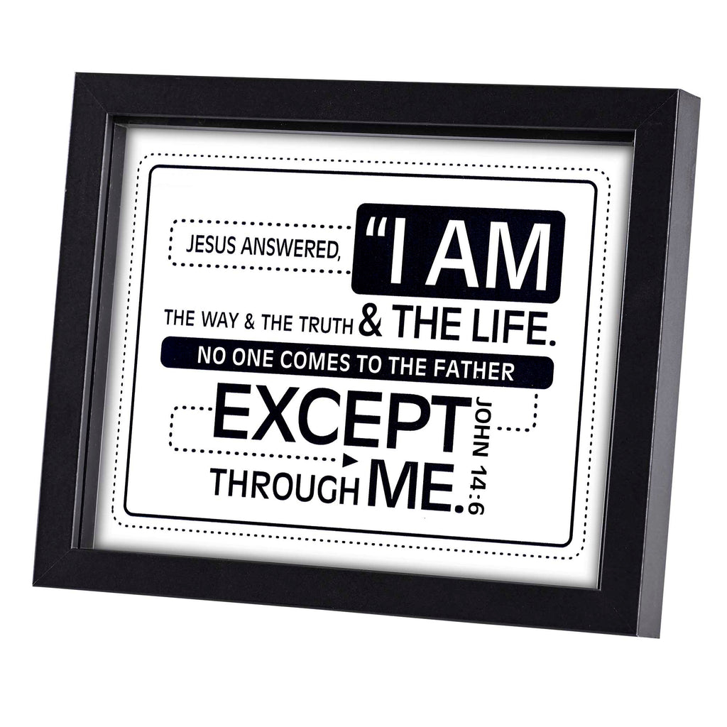 Decorate your home with reminders of the truth with this versatile wall or tabletop framed sentiment art print Features sentiment that reads "Jesus answered, 'I am the way and the truth and the life. No one comes to the Father except through me. John 14:6'". Made of wood Black text is printed on the underside of glass that sits 3/4 inch above a white background. Outer frame measures approximately 11 x 9 Art print under glass measures approximately 10 x 8 inches Removable back includes pull-out easel plus hanging hooks for either tabletop or wall display. Perfect for gifting to yourself or someone else for a birthday, Christmas, anniversary, or any other special event An excellent way to encourage a loved one in your life. Contained in protective packaging Ready for easy gifting for Christmas, a birthday, an anniversary, or any special occasion!