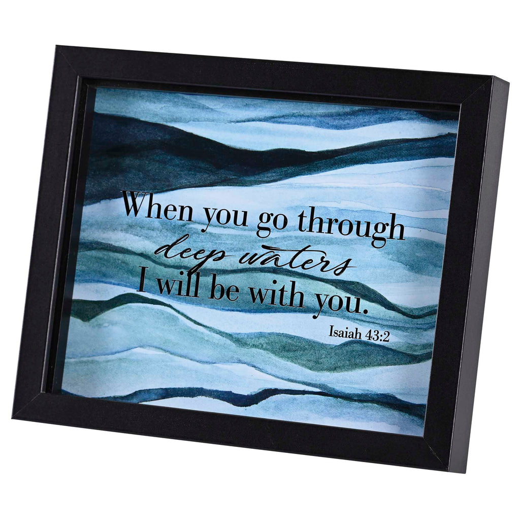 Decorate your home with reminders of the truth with this versatile wall or tabletop framed sentiment art print Features sentiment that reads "When you go through deep waters I will be with you. Isaiah 43:2". Made of wood Bold black text is printed on the underside of glass that sits 3/4 inch above a watercolor style ocean sea-style blue background. Outer frame measures approximately 11 x 9 Art print under glass measures approximately 10 x 8 inches Removable back includes pull-out easel plus hanging hooks for either tabletop or wall display. Perfect for gifting to yourself or someone else for a birthday, Christmas, anniversary, or any other special event An excellent way to encourage a loved one in your life. Contained in protective packaging Ready for easy gifting for Christmas, a birthday, an anniversary, or any special occasion!