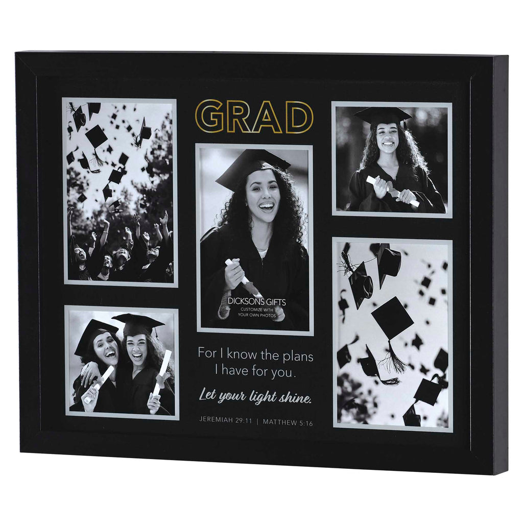 Celebrate your graduate’s milestone with this elegant black photo collage frame featuring the inspiring words “For I know the plans I have for you: Let your light shine” — a heartfelt nod to Matthew 5:16 and Jeremiah 29:11. Includes six photo openings — perfect for displaying graduation portraits, cap toss moments, and group photos. Crafted with a wooden frame, glass panel, and black matboard Parts of the design are printed directly on the glass white the rest are on an insert giving the piece a dimensional look. Frame measures approximately 12 x 15 inches Back panel removes easily to insert your personal photos, while the sturdy hanger allows for simple wall mounting. Adds sophistication to any wall or tabletop display while keeping the focus on your cherished memories