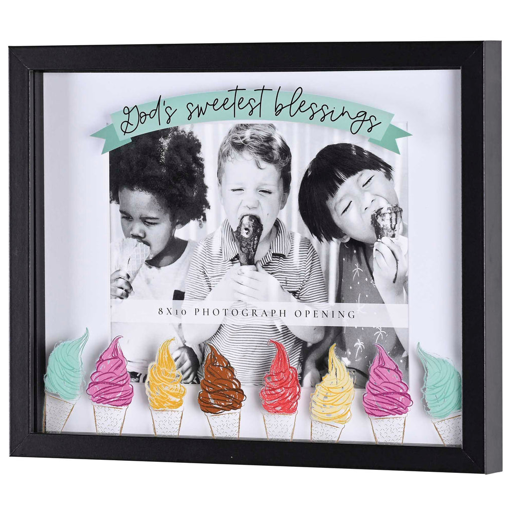 Decorative sign features a charming message with beautiful artwork that will add interest to your decorating spaces Features a pleasing dimensional effect. Artwork reads "Gods Sweetest Blessings" in trendy font and is encouraging to the beholder. Frame can be easily hung on a wall with its hanger or simply set on a shelf with its easel back Measures approximately 15 x 12 inches and holds a 8 x 10 inch photo Made of wood and glass material. Perfect atop a shelf, nestled on a mantel, or hanging from your favorite wall Adding welcoming character to any space in your home. Contained in protective packaging Ready for easy gifting for a birthday, holiday, Christmas, Mother's Day or other celebration