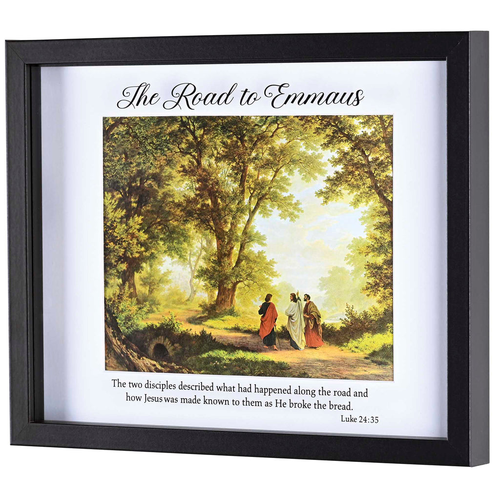 Decorate your home with reminders of the truth with this wall hanging framed sentiment art print Features sentiment that reads "The road to Emmaus / The two disciples described what happened along the road and how Jesus was made known to them as He broke the bread. Luke 24:35". Made of wood Text is printed on the underside of glass that sits 3/4 inch above artwork of Jesus and the disciples on a road. Outer frame measures approximately 12 x 15 Art print under glass measures approximately 11 x 14 inches Removable back includes hangers on back for easy wall display. Perfect for gifting to yourself or someone else for a birthday, Christmas, anniversary, or any other special event An excellent way to encourage a loved one in your life. Contained in protective packaging Ready for easy gifting for Christmas, a birthday, an anniversary, or any special occasion!