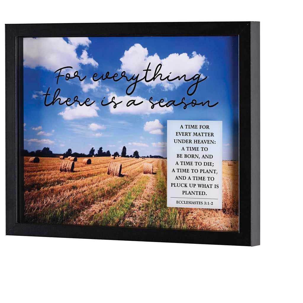 Decorate your home with reminders of the truth with this versatile wall hanging framed sentiment art print Features sentiment that reads "For everything this is a season / A time for every matter under heaven: a time to be born, and a time to die a time to plant and a time to pluck up what is planted. Ecclesiastes 3:1-2. Made of wood Text is printed on the underside of glass that sits 3/4 inch above artwork of a field with hay bales. Outer frame measures approximately 12 x 15 Art print under glass measures approximately 11 x 14 inches Removable back includes hangers on back for easy wall display. Perfect for gifting to yourself or someone else for a birthday, Christmas, anniversary, or any other special event An excellent way to encourage a loved one in your life. Contained in protective packaging Ready for easy gifting for Christmas, a birthday, an anniversary, or any special occasion!