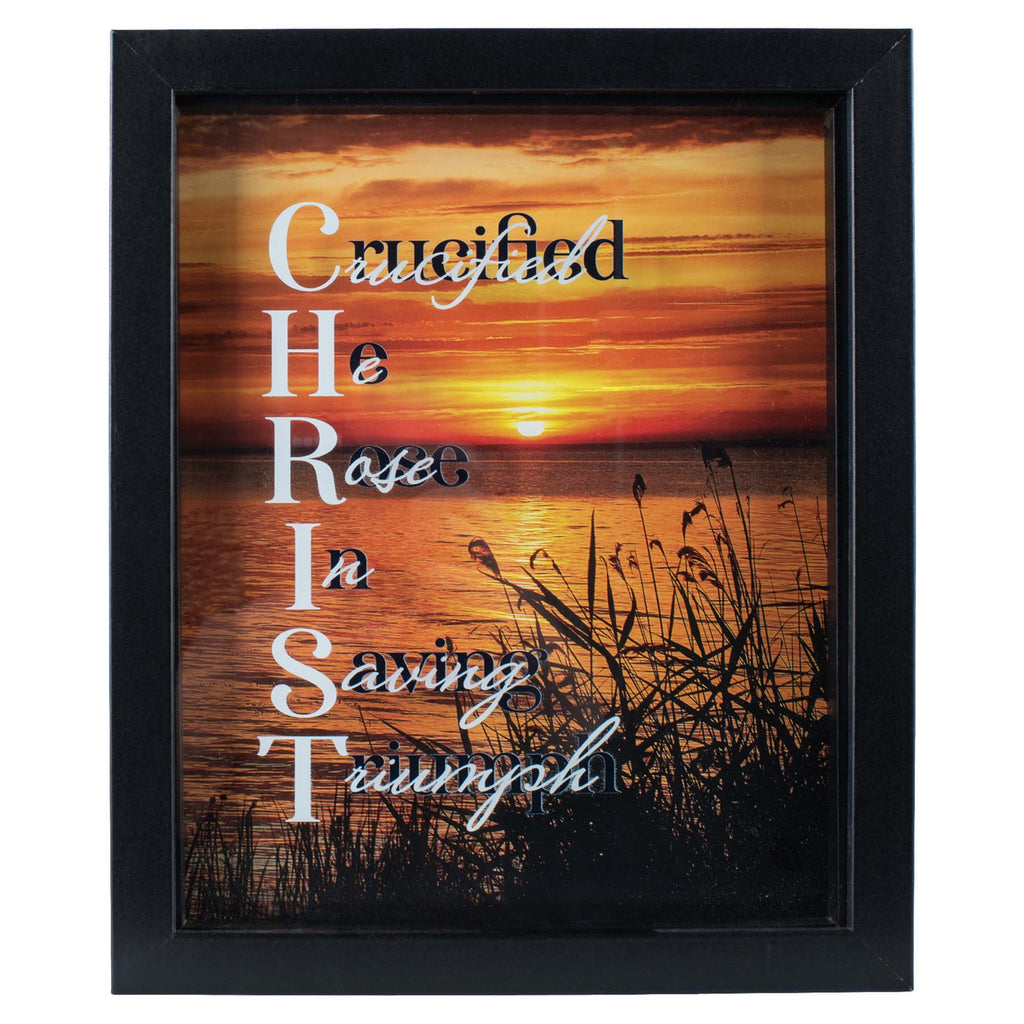 As a thoughtfully-designed home décor accessory, this wall art helps you show off your style, while also showcasing a great, faith-filled reminder Features sentiment "Crucified He Rose In Saving Triumph". Charming photo frame is made of an MDF (medium density fiberboard material) with glass covering your print. Outer frame measures approximately 9 x 11 x 1.25 inches, print size is 8 x 10 Back of frame includes pull out easel plus a hanger. Perfect atop a shelf, nestled on a mantel, or hanging in your favorite room. Contained in protective packaging Ready for easy gifting for a birthday, Mother's day or any other special event