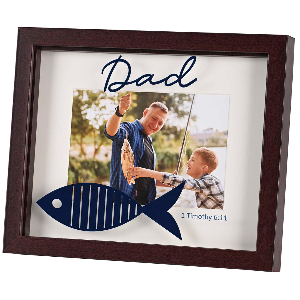 Shadow box style photo frame features the Christian fish and text: DAD - 1 Timothy 6:11 Text is printed on the underside of glass that sits 3/4 inch above the photo insert. The frame is made from high-quality Medium-Density Fiberboard (MDF), sturdy glass pane protects your photo from dust and damage, keeping your treasured memories preserved for years Includes a white mat for your personal photo. Measures 11 x 9 inches Holds a 5 x 7 inch print. Designed to stand or hang effortlessly, making it suitable for desktops, shelves, or wall displays. Contained in protective packaging Ready for easy gifting