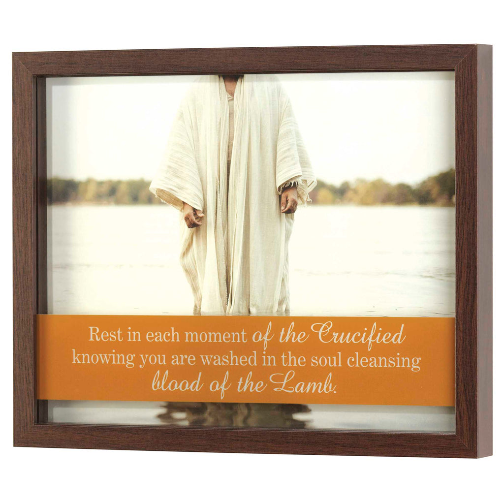 Beautiful image of a road stretching towards the mountains featured on the background Sentiment reads "The world needs to see God through you / Keep going". Text is arranged on the underside of the glass that is set about 3/4 inch above the backdrop Creates a beautiful shadowbox style effect. Brown woodgrain MDF finish frame and glass inner pane Frame measures approximately 9 x 11 x 1.25 inches. Hanger on back and fold out easel allow for easy display on a wall or tabletop. Contained in protective packaging Ready for easy gifting for a birthday, holiday, or other celebration
