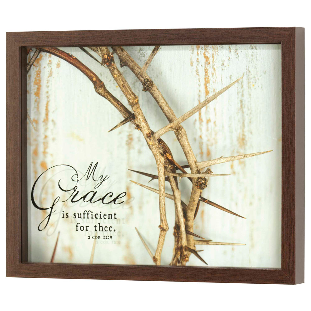 Beautiful modern frame contains chalice and other food graphic art with surrounding encouraging text Sentiment reads "My first communion - May the Holy Spirit strengthen your life in Christ, guide you in following his way, and help you to share your faith with the world. May the God of hope fill you will all joy and peace in believing, so that you may abound in hope by the power of the Holy Spirit. Romans 15:13". Text is arranged on the underside of the glass that is set about 3/4 inch above the backdrop Creates a beautiful shadowbox style effect. Natural brown woodgrain MDF finish frame and glass inner pane Frame measures approximately 15 x 12 x 1.25 inches Print size measures approximately 6 x 8 inches Glass panel measures approximately 11 x 14 inches. Hanger on back for easy wall hanging. Contained in protective packaging Ready for easy gifting for a birthday, holiday, or other celebration