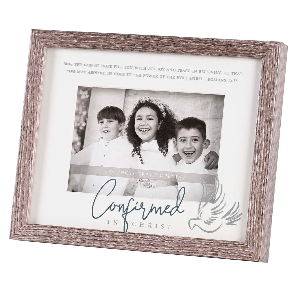 Decorate your home with reminders of the truth with this versatile wall of tabletop framed sentiment art print Features sentiment that reads "Confirmed in Christ / May the God of hope fill you with all joy and peace in believing, so that you may abound in hope by the power of the Holy Spirit. Romans 15:13". Made of wood Text and a watermarked dove are printed on the underside of glass that sits 3/4 inch above a white matboard. Outer frame measures approximately 11 x 9 Window size under glass measures approximately 10 x 8 inches Removable back includes pull-out easel plus hanging hooks for either tabletop or wall display 7 x 5 inch picture can be added to the frame. Perfect for gifting to yourself or someone else for a birthday, Christmas, anniversary, or any other special event An excellent way to encourage a loved one in your life. Contained in protective packaging Ready for easy gifting for Christmas, a birthday, an anniversary, or any special occasion!