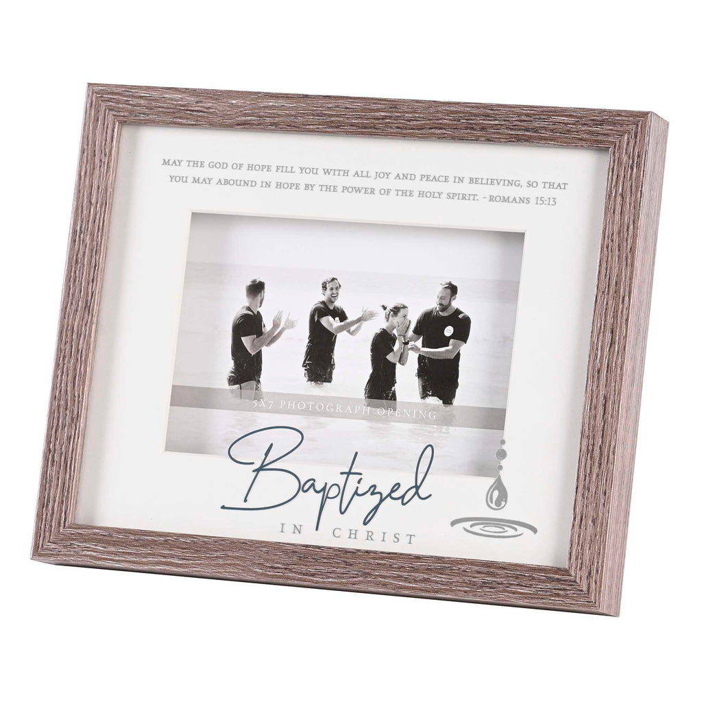 Decorate your home with reminders of the truth with this versatile wall of tabletop framed sentiment art print Features sentiment that reads "Baptized in Christ / May the God of hope fill you with all joy and peace in believing, so that you may abound in hope by the power of the Holy Spirit. Romans 15:13". Made of wood Text and watermarked water droplet are printed on the underside of glass that sits 3/4 inch above a white matboard. Outer frame measures approximately 11 x 9 Window size under glass measures approximately 10 x 8 inches Removable back includes pull-out easel plus hanging hooks for either tabletop or wall display 7 x 5 inch picture can be added to the frame. Perfect for gifting to yourself or someone else for a birthday, Christmas, anniversary, or any other special event An excellent way to encourage a loved one in your life. Contained in protective packaging Ready for easy gifting for Christmas, a birthday, an anniversary, or any special occasion!