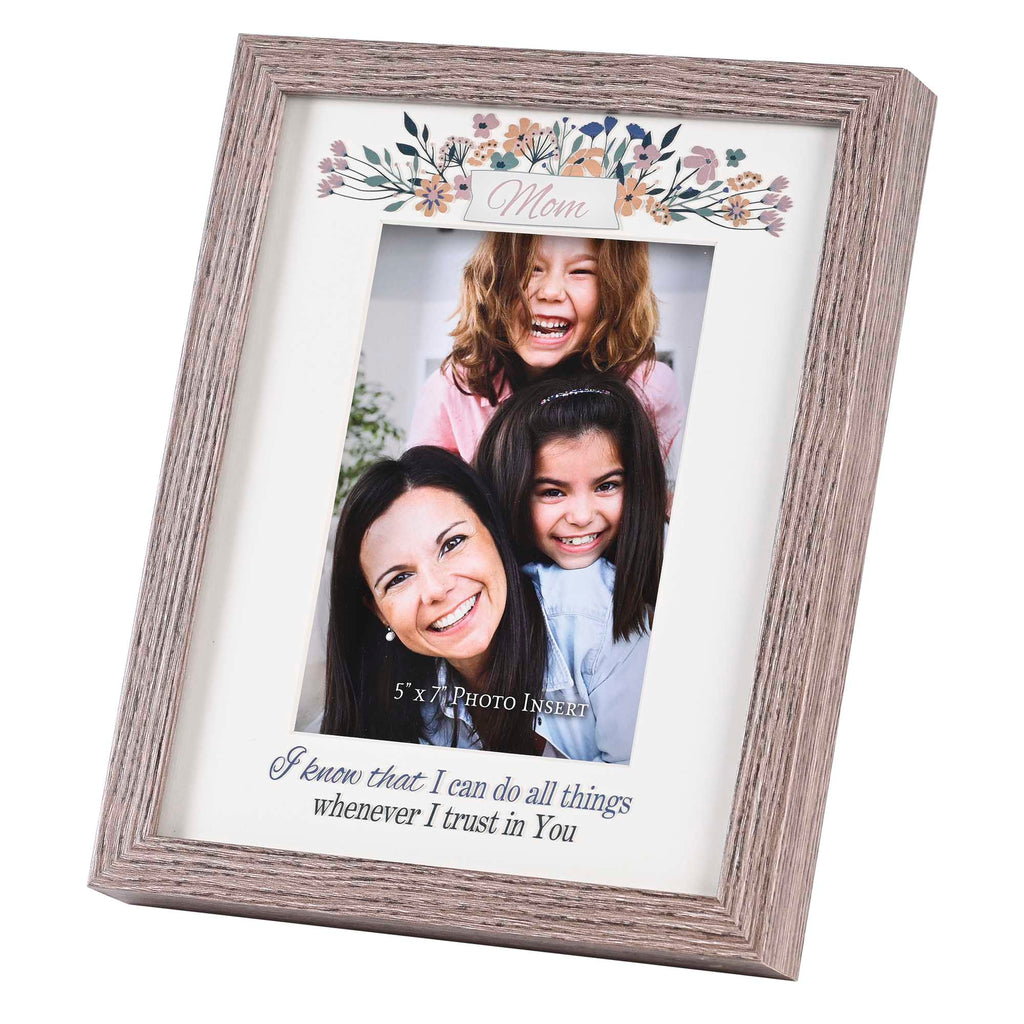 Decorate your home with reminders of the truth with this versatile wall of tabletop framed sentiment art print Features sentiment that reads "Mom / I know that I can do all things whenever I trust in You". Made of wood Text and floral top border are printed on the underside of glass that sits 3/4 inch above a white matboard. Outer frame measures approximately 11 x 9 Window size under glass measures approximately 10 x 8 Removable back includes hangers for easy wall hanging 5 x 7 inch picture can be added to the frame. Perfect for gifting to yourself or someone else for a birthday, Christmas, anniversary, or any other special event An excellent way to encourage a loved one in your life. Contained in protective packaging Ready for easy gifting for Christmas, a birthday, an anniversary, or any special occasion!