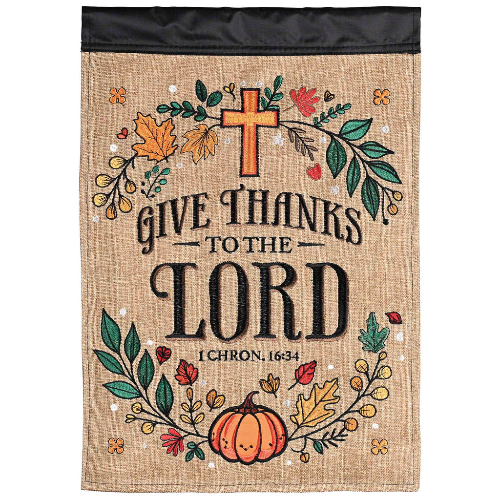 Features the Bible verse “Give Thanks to the Lord – I Chron. 16:34” in bold black lettering, accented with a golden cross, autumn leaves, florals, and a pumpkin on a rustic burlap background. This flag is heavier and longer lasting than most flags, using a sturdy 300-denier polyester Design is a combination of fabric appliques and exquisitely detailed embroidery on both the front and back, increasing your display options. Measures approximately 13 x 18 inches Fits most standard size garden flag poles Pole NOT included. Flag will retain its color and beauty for years if displayed in shade or semi-shade, and is rainproof Handwash recommended. Whether you place it on your front lawn, porch, patio, or flower bed, it’s an instant seasonal upgrade to your outdoor décor Contained within protective packaging Ready for easy gifting