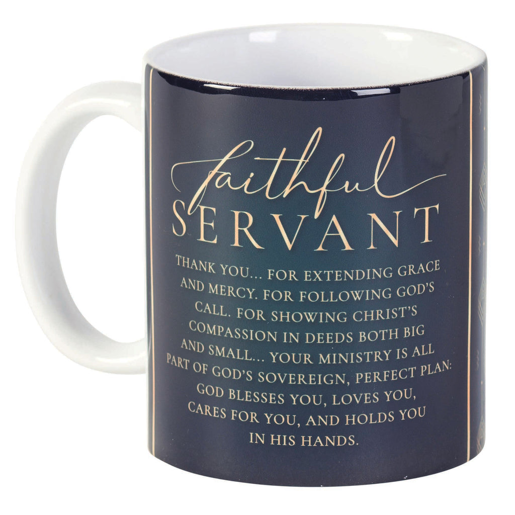 Warm his hands and heart with this mug that features a diamond cross finish and sentiment reading “Faithful servant Thank you… For extending grace and mercy For following God’s call For showing Christ’s compassion in deeds both big and small…Your ministry is all part of God’s sovereign, perfect plan: God blesses you, loves you, care for you, and holds you in his hands”. Dual-sided artwork on white mug features sentiment "Faithful Servant" with sweet poem about God's grace. Made of a quality ceramic stoneware Top rack dishwasher and microwave safe. Mug holds approximately 11 fluid ounces of your favorite hot or cold beverage. Contained in protective packaging Ready for easy gifting for a birthday, holiday, or other memorable moment