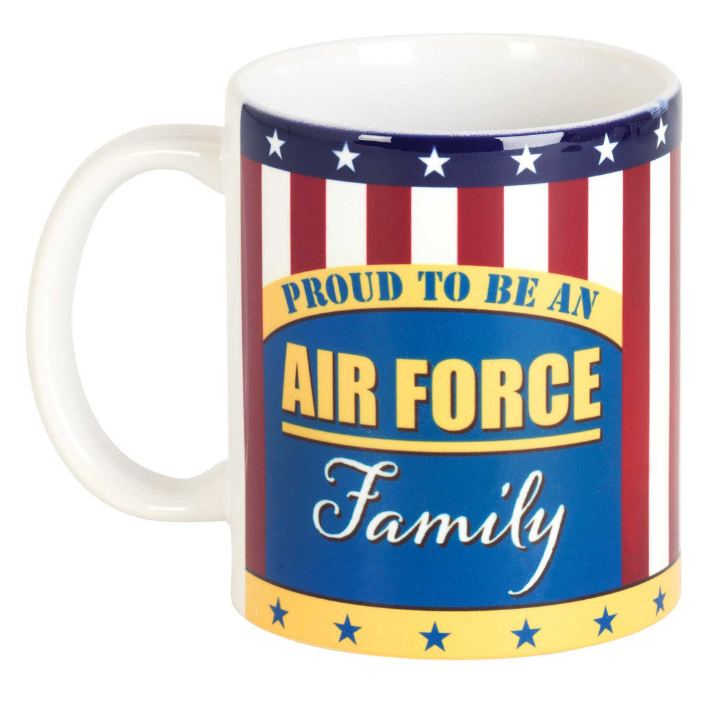 Patriotic mug is the perfect way to show your support Features sentiment "Proud to be an Air Force Family". Coffee mug is made from a quality ceramic material Microwave and dishwasher safe. Cup holds up to 11 ounces of your favorite warmed beverage. Perfect for sipping your favorite coffee, tea, or other hot drink Makes an excellent gift for that special person in your life great for entertainment and durable for everyday use. Contained in protective packaging Ready for easy gifting for a birthday, holiday, Christmas, Mother's Day or other celebration