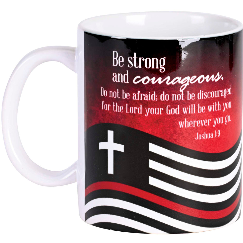 Encouraging mug features a Christian Flag with black and red coloring and the scripture verse "Be Strong and Courageous" and "Do not be afraid do not be discouraged for the Lord your God will be with you wherever you go." Joshua 1:9. Coffee mug is made from a quality ceramic material Microwave and dishwasher safe. Cup holds up to 11 ounces of your favorite warmed beverage. Perfect for sipping your favorite coffee, tea, or other hot drink Makes an excellent giftable for that special person in your life great for entertainment and durable for everyday use. Contained in protective packaging Ready for easy gifting for a birthday, holiday, Christmas, Mother's Day or other celebration
