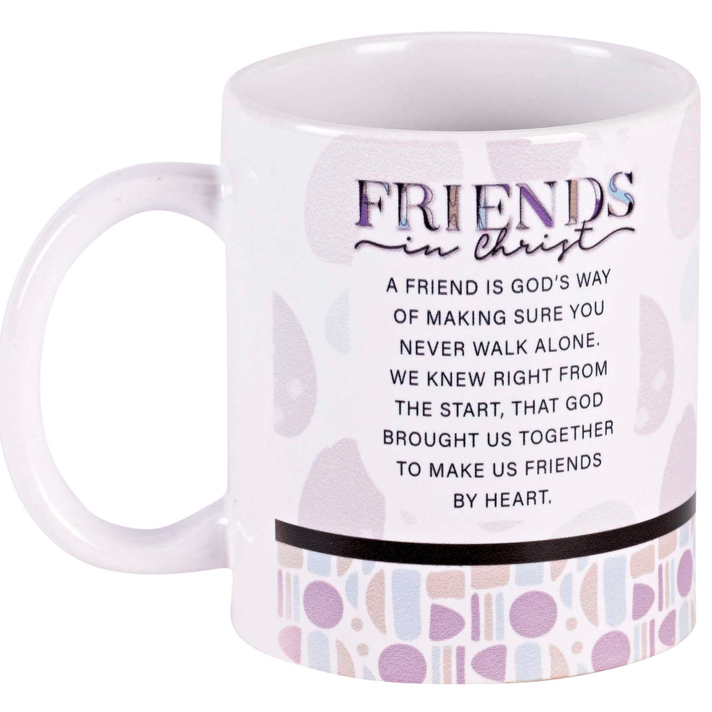 Poem and whimsical design are on both sides: 'Friends in Christ -A friend is Gods way of making sure you never walk alone. We knew right from the start, that God brought us together to make us friends by heart'. Crafted with high-quality ceramic, this mug is both durable and stylish. Holds approximately 11 fluid ounces Microwave/dishwasher safe. Make every sip a moment of reflection and inspiration. Contained in protective packaging Ready for easy gifting