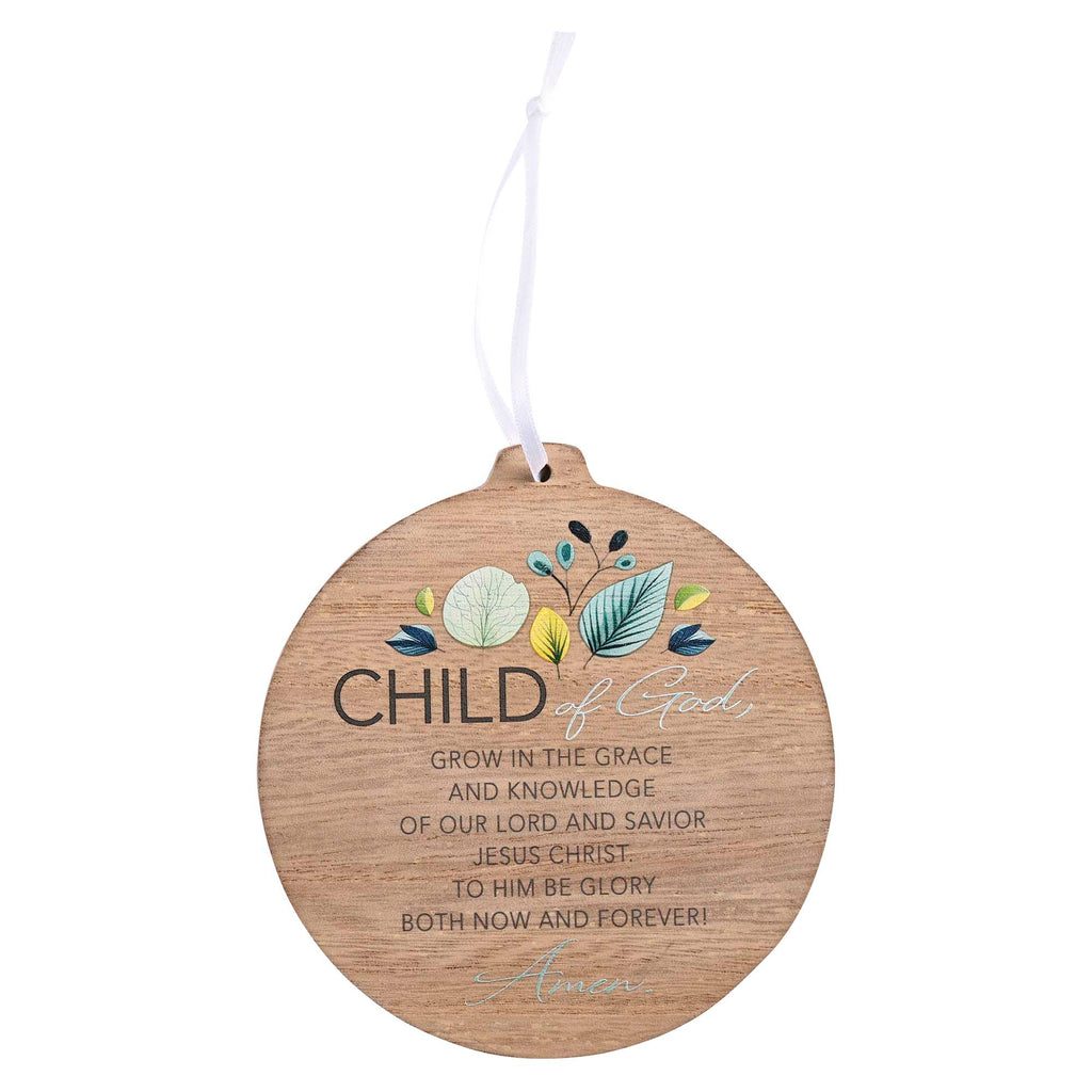 Features teal and yellow foliage on a woodgrain background with front text: Child of God, Grow in the grace and knowledge of our Lord and Savior Jesus Christ. To Him be glory both now and forever! Amen The back has the same foliage accent with space for personalization. Made from high-quality MDF (Medium Density Fiberboard), lightweight yet sturdy, ensuring it will be a treasured keepsake for years to come The smooth surface is ideal for personalization. Measures approximately 4 inches in diameter Comes ready to hang with white fabric ribbon. Perfect for commemorating special milestones, this ornament is a meaningful keepsake for baptisms, confirmations, or any occasion honoring a spiritual journey. Contained in protective packaging Ready for easy gifting
