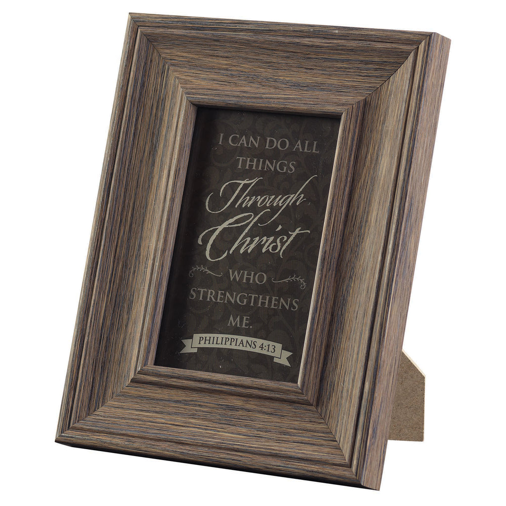 Brighten up any living space with this home décor piece featuring textured like wood frame and sentiment reading “I can do all things through Christ who strengthens me Philippians 4:13". Photo frame is made of a durable MDF material with easel back for easy tabletop display. Measures approximately 9 x 7 inches Holds a 4 x 6 inch personal photo if you choose to swap out the print. Perfect for display on a tabletop, shelf arrangement, or mantel to add welcoming character to any space in your home. Contained in protective packaging Ready for easy gifting for a birthday, holiday, or other memorable moment