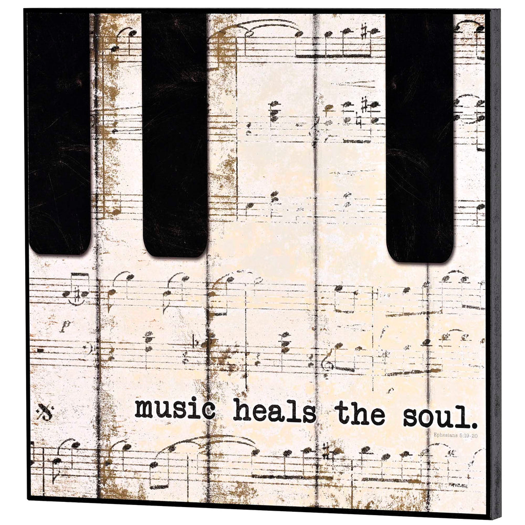 Wall plaque features piano keys and sheet music By Masey St. Studios, with text: 'Music Heals The Soul'. Made from sturdy MDF wood, ensuring long-lasting durability and a smooth finish Edges are finished in black. Measures approximately 12 x 12 inches Display on a tabletop or slot on back for easy hanging. Timeless design and high-quality materials ensure it will be a cherished piece for years to come. Contained in protective packaging Makes an excellent gift for housewarmings, weddings, birthdays, or anniversaries