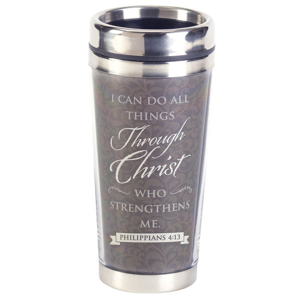 Travel with your coffee or tea in style with this unique and stylish travel tumbler featuring coffee finish on a wrap-around design with attractive, trendy font featuring sentiment “I can do all things through Christ who strengthens me Philippians 4:13”. Beautiful full wrap around artwork design Fits most standard sized cup holders. Holds approximately 16 ounces of your favorite hot or cold beverage Hand wash only, do not microwave. Made from quality stainless steel Push top lid with silicone gasket seal and sliding closure to help maintain temperature for hours. Contained in protective packaging Ready for easy gifting for a birthday, holiday, or other memorable moment