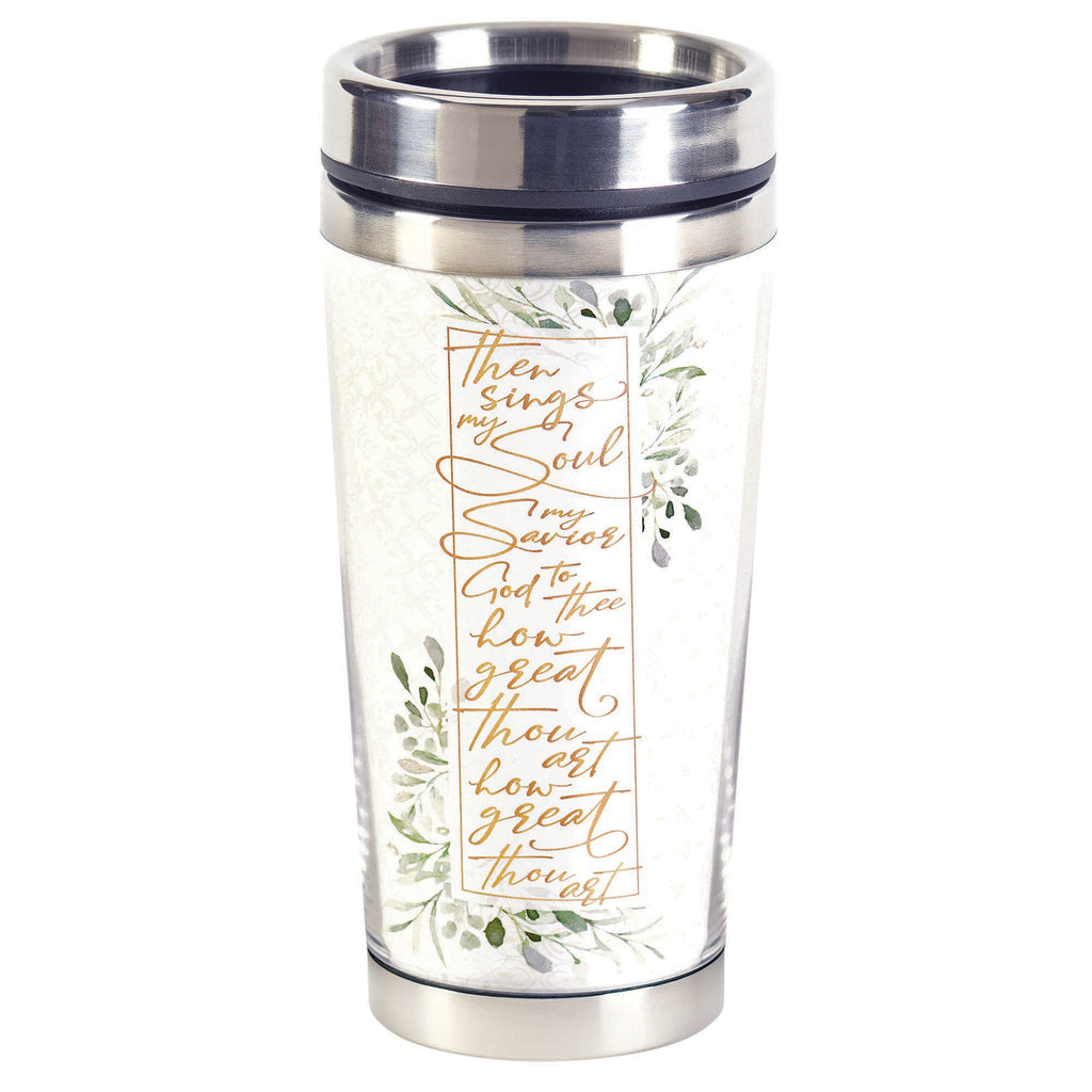 Travel with your coffee or tea in style with this unique and stylish travel tumbler featuring classic cream finish with green leafy accents on a wrap-around design with attractive, trendy font featuring sentiment “Then sings my soul my Savior God to thee, how great thou art”. Beautiful full wrap around artwork design Fits most standard sized cup holders. Holds approximately 16 ounces of your favorite hot or cold beverage Hand wash only, do not microwave. Made from quality stainless steel Push top lid with silicone gasket seal and sliding closure to help maintain temperature for hours. Contained in protective packaging Ready for easy gifting for a birthday, holiday, or other memorable moment