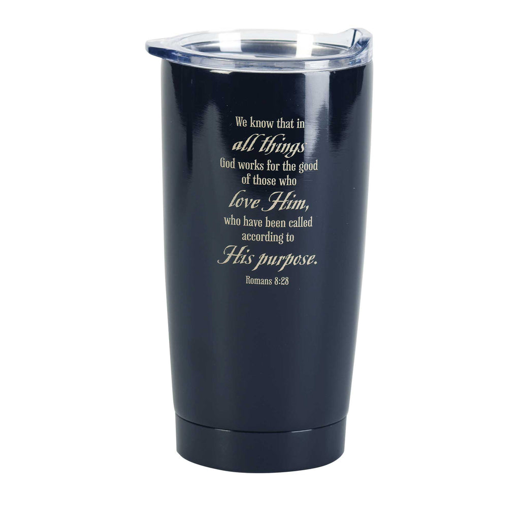Artwork reads "We know that in all things God works for the good of those who love Him, who have been called according to His purpose." Romans 8:28 in a trendy and fun font and fun graphic design. Made of quality stainless steel metal with black finish and clear acrylic lid Recommended hand wash only. Holds approximately 20 ounces of your favorite hot or cold beverage Fits most standard car cupholders. Push top lid with silicone gasket seal and sliding closure to help keep temperature for hours. Contained in protective packaging Ready for easy gifting for the holidays, a birthday, or any other special event