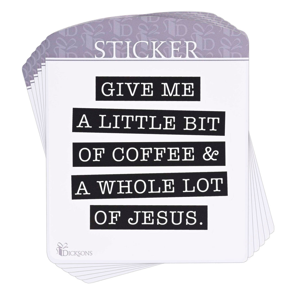 This sticker features text: Give me a little bit of coffee and a whole lot of Jesus Comes as a pack of 6. Made from high-quality paper materials. Each sticker measures approximately 6.5 x 5.25 inches. Smooth and easy to apply, making it ideal for decorating personal items, water bottles, Bible covers, or scrapbooks. Contained in protective packaging Ready for easy gifting
