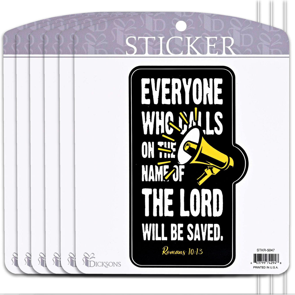 Delight, encourage, and inspire with these decorative stickers Presents verse, "Everyone who calls on the name of the Lord will be saved" - Romans 10:13. Sold as a pack of six Sheets measure approximately 3.75 x 4.75 inches. Printed on vinyl material with vibrant colors that maintain their brightness over time Self-adhesive backing makes them simple to peel and stick. Perfect for adorning gifts, cards, books, journals, tumblers, or other accessories. Contained within protective packaging Ready for easy gifting