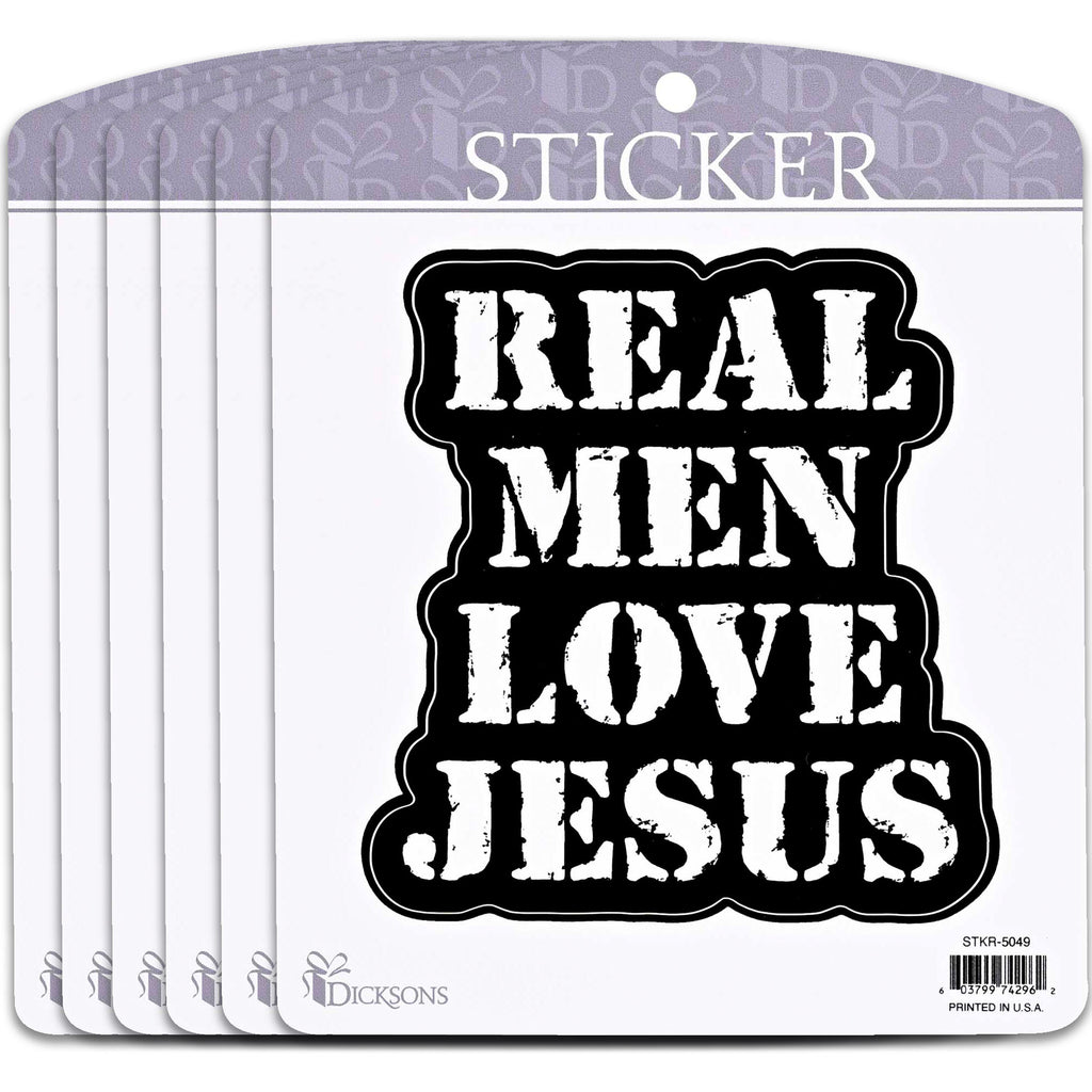 Delight, encourage, and inspire with these decorative stickers Presents sentiment, "Real men love Jesus". Sold as a pack of six Sheets measure approximately 3.75 x 4.75 inches. Printed on vinyl material with vibrant colors that maintain their brightness over time Self-adhesive backing makes them simple to peel and stick. Perfect for adorning gifts, cards, books, journals, tumblers, or other accessories. Contained within protective packaging Ready for easy gifting