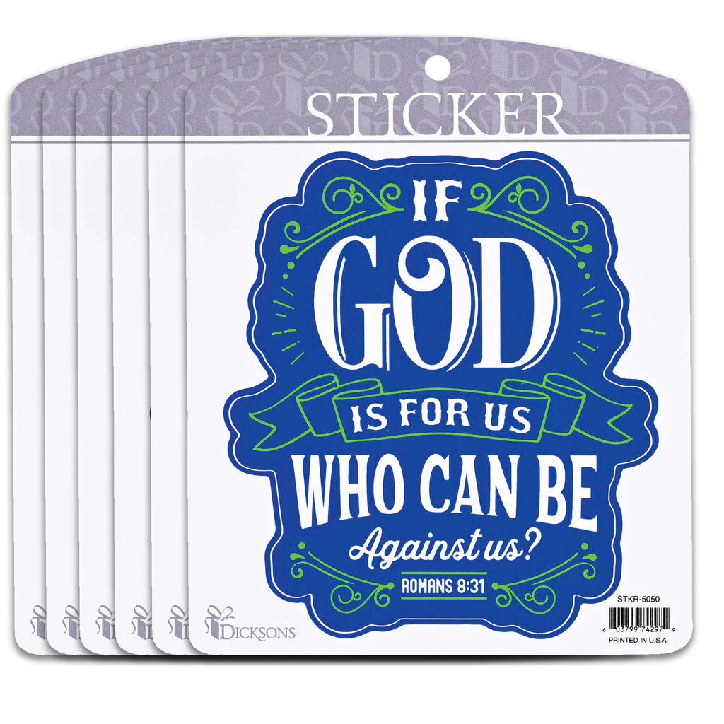 Delight, encourage, and inspire with these decorative stickers Presents verse, "If God is for us who can be against us" - Romans 8:31. Sold as a pack of six Sheets measure approximately 3.75 x 4.75 inches. Printed on vinyl material with vibrant colors that maintain their brightness over time Self-adhesive backing makes them simple to peel and stick. Perfect for adorning gifts, cards, books, journals, tumblers, or other accessories. Contained within protective packaging Ready for easy gifting