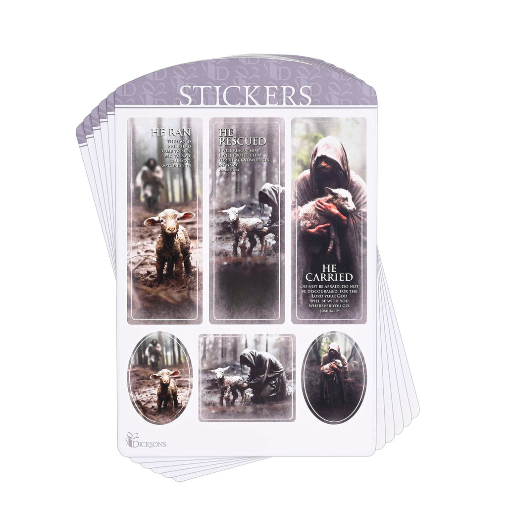 This sticker assortment features The Good Shepherd theme with text and scripture from Joshua 1:9 Comes as a pack of 6 sheets. Made from high-quality paper materials. Each sticker measures approximately 6.5 x 5.25 inches. Smooth and easy to apply, making it ideal for decorating personal items, water bottles, Bible covers, or scrapbooks. Contained in protective packaging Ready for easy gifting