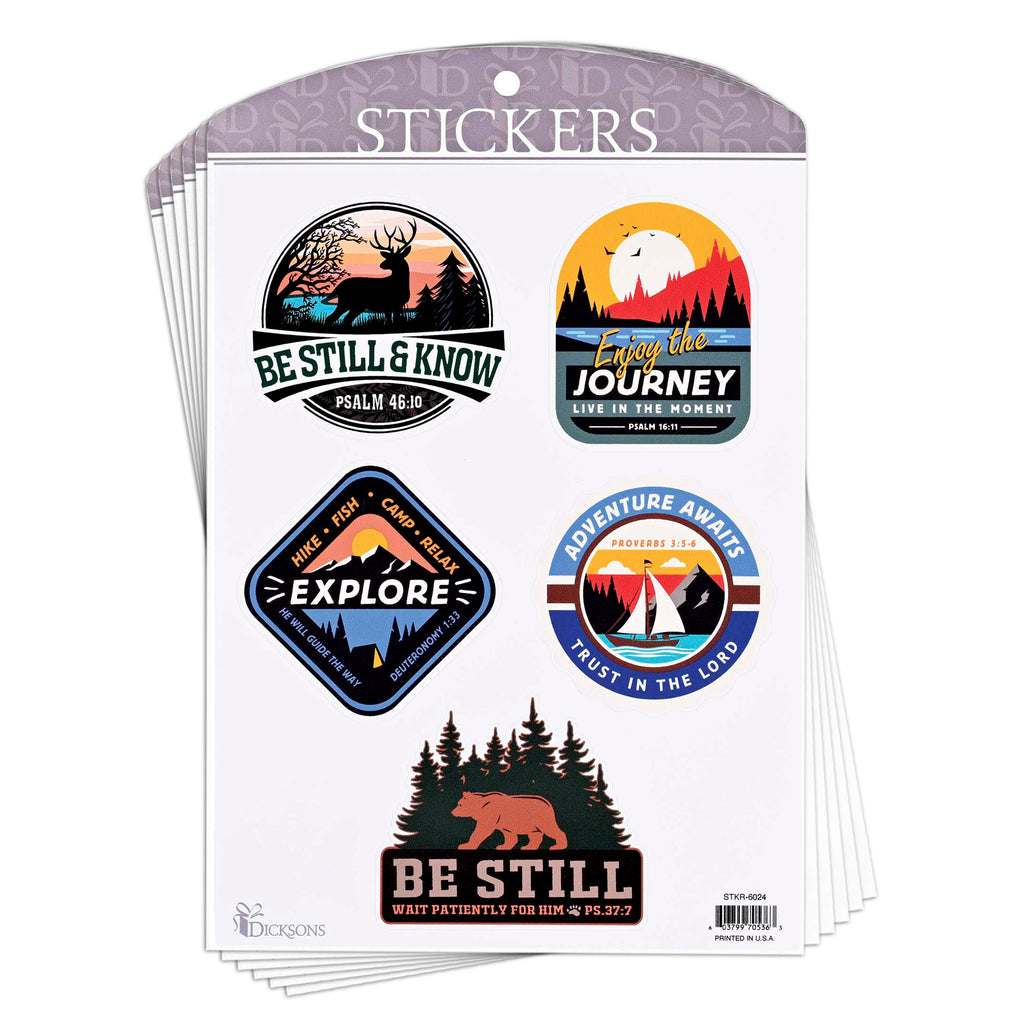 This sticker assortment features an exploration nature theme, with a scripture reference on each. Crafted from high-quality vinyl, this decal is designed to be durable and weather-resistant, ensuring it stays vibrant and intact even in outdoor settings. Stickers come on a 9 x 6 inch card with 5 stickers each Comes as a pack of 6. Perfect for personalizing cars, lockers, laptops, water bottles, or walls, this versatile decal offers a meaningful reminder of divine guidance and protection. Contained in protective packaging Ready for easy gifting Proudly printed in the USA