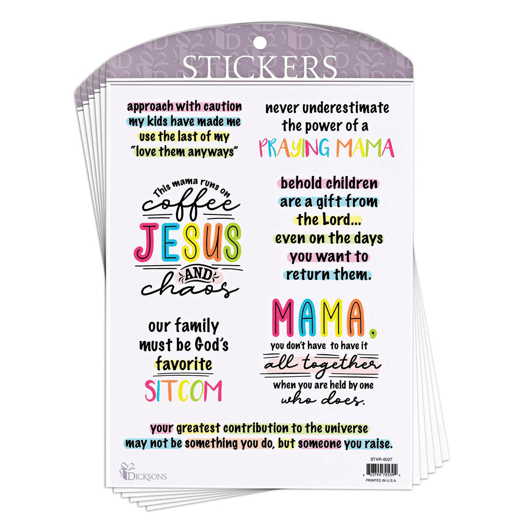 This sticker assortment features stickers for the special mom in your life. Crafted from high-quality vinyl, this decal is designed to be durable and weather-resistant, ensuring it stays vibrant and intact even in outdoor settings. Stickers come on a 9 x 6 inch card with 7 stickers each Comes as a pack of 6. Perfect for personalizing cars, lockers, laptops, water bottles, or walls, this versatile decal offers a meaningful reminder of divine guidance and protection. Contained in protective packaging Ready for easy gifting Proudly printed in the USA