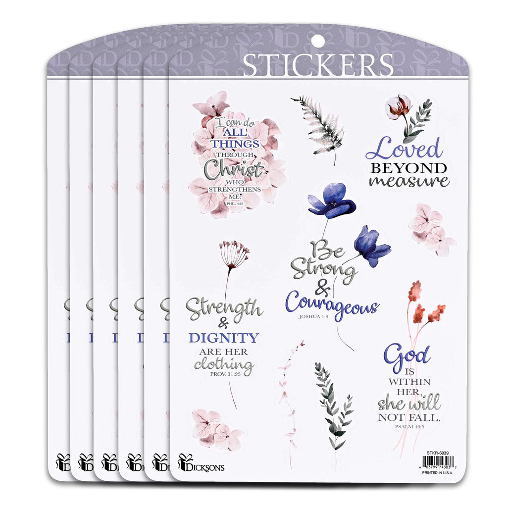 Delight, encourage, and inspire with these decorative stickers Showcases beautiful floral designs paired with beloved verses from the Bible. Sold as a pack of six Sheets measure approximately 3.75 x 4.75 inches. Printed on vinyl material with vibrant colors that maintain their brightness over time Self-adhesive backing makes them simple to peel and stick. Perfect for adorning gifts, cards, books, journals, tumblers, or other accessories. Contained within protective packaging Ready for easy gifting