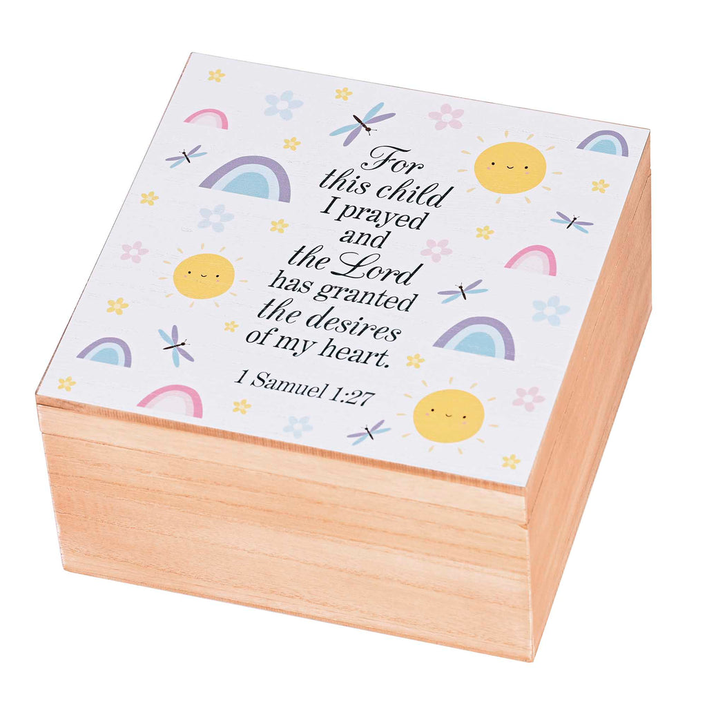 The top of this keepsake box features a whimsical baby theme with '1 Samuel 1:27 For this child I prayed and the Lord has granted the desires of my heart'. Storage box is made of MDF wood Outside of box has a rustic wood appearance and matte feel. Exterior dimensions measure approximately 9.5 x 9.5 x 5 inches Large size can obtain a variety of keepsakes, photo storage and memorabilia Hinged lid opens to show a holder underneath for a special 6 x 4 horizontal photo. Whether you're commemorating a milestone, preserving family traditions, or seeking a refined storage solution for sentimental items, our keepsake box is the epitome of sophistication and sentimental value. Contained in protective packaging Ready for easy gifting