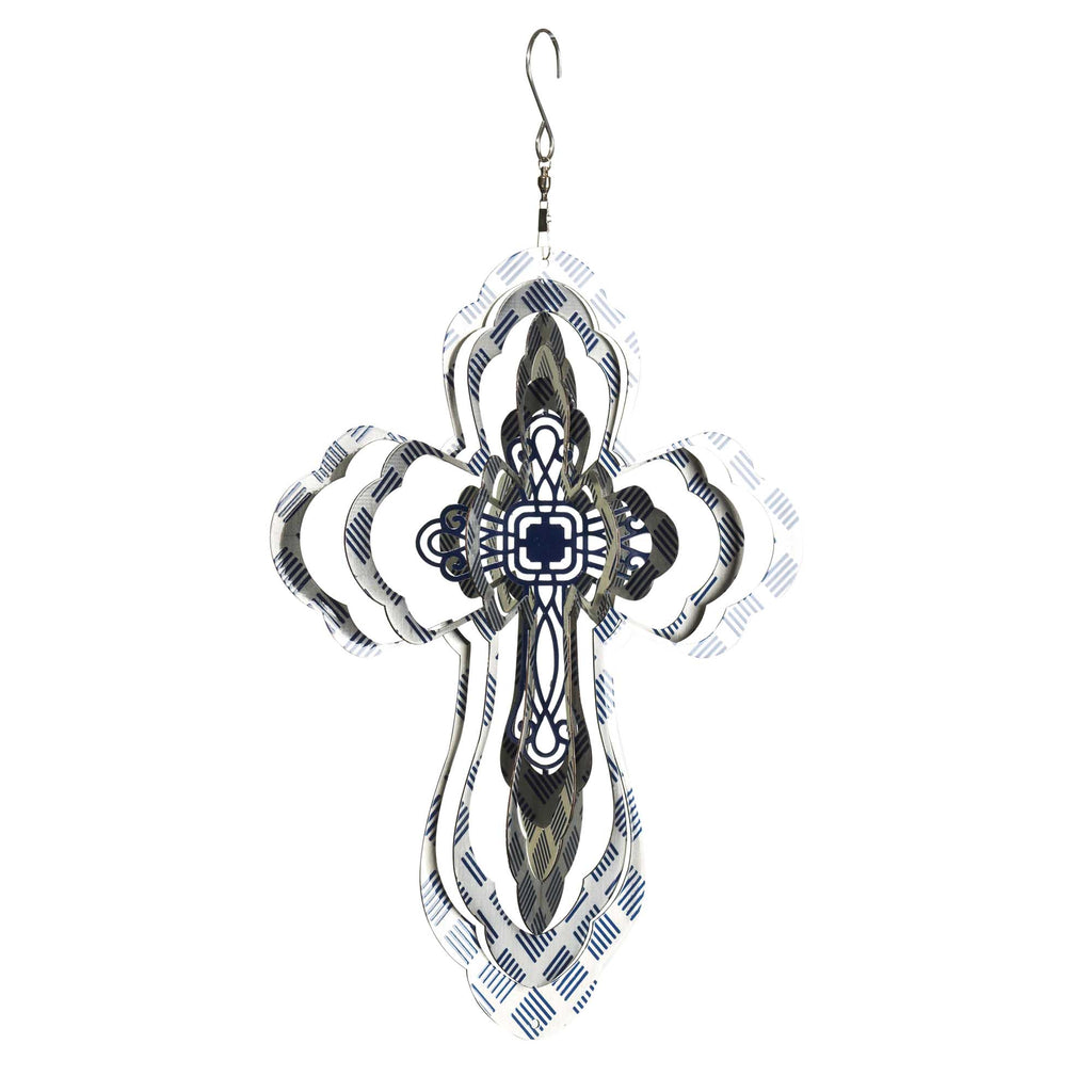 Add sentimental charm to your outdoor living spaces with this beautiful wind spinner Multidimensional Cross shape features beautiful navy blue lines. Made from a high quality stainless steel material with metal hook for easy display. Measures approximately 9.5 x 7 x 12 inches. Perfect for adding character to your outdoor patio, garden, porch living space. Contained in protective packaging Ready for easy gifting for a birthday, holiday, Christmas, Mother's Day or other celebration